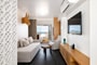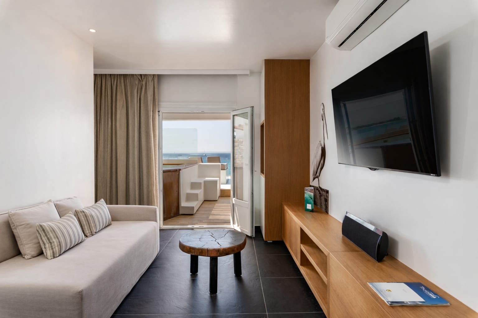 Designed for comfort and understated elegance, the suite offers a private balcony with sea views, an outdoor jetted tub, and a refined bathroom. Contemporary interiors include a king-size bed and a sofa bed, along with individually controlled air conditioning, satellite TV, direct-dial telephone, music system, minibar/refrigerator, and hairdryer. Accommodates up to four guests.