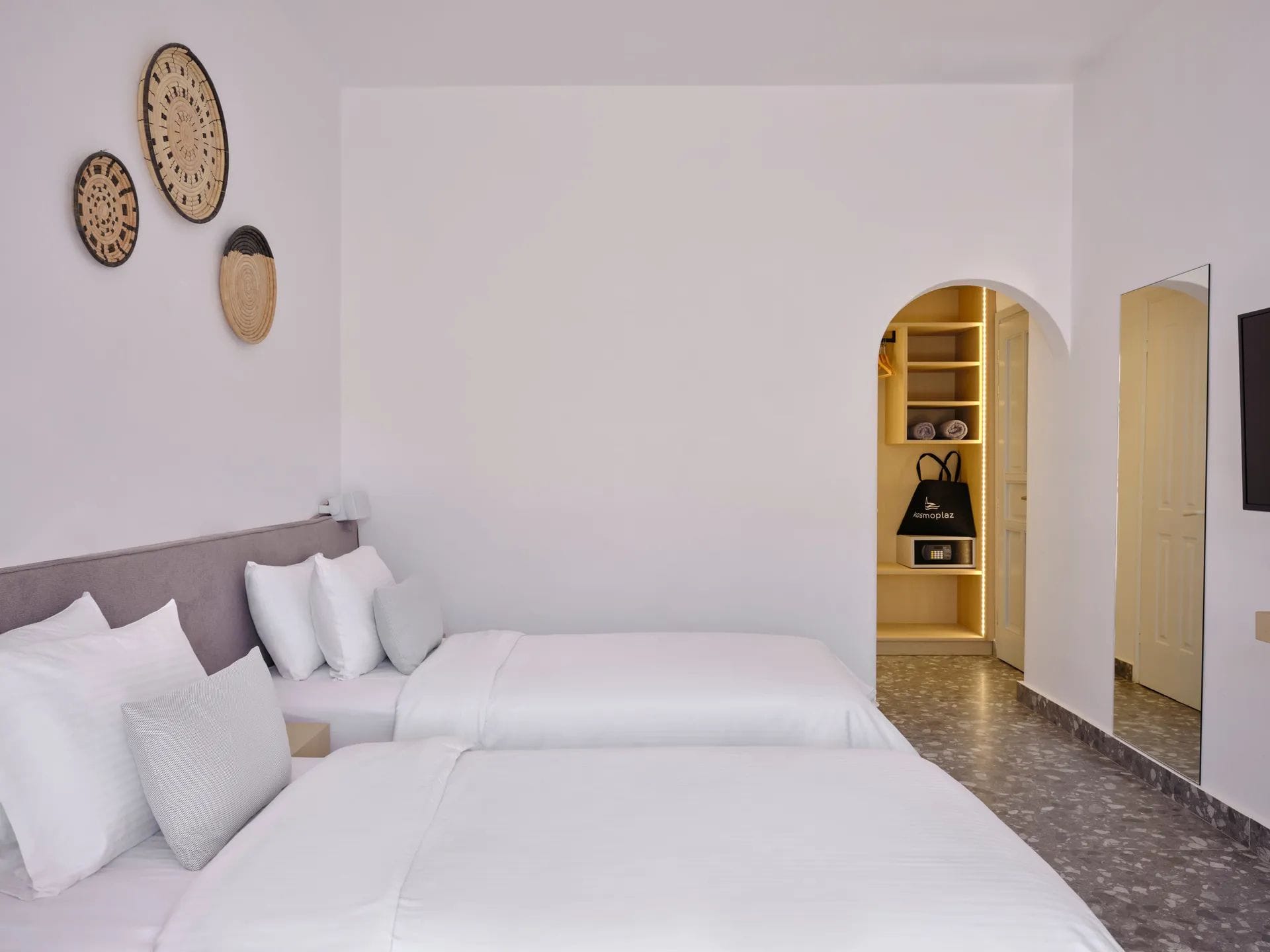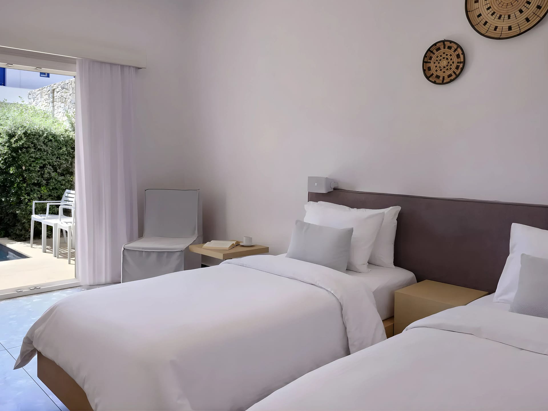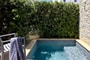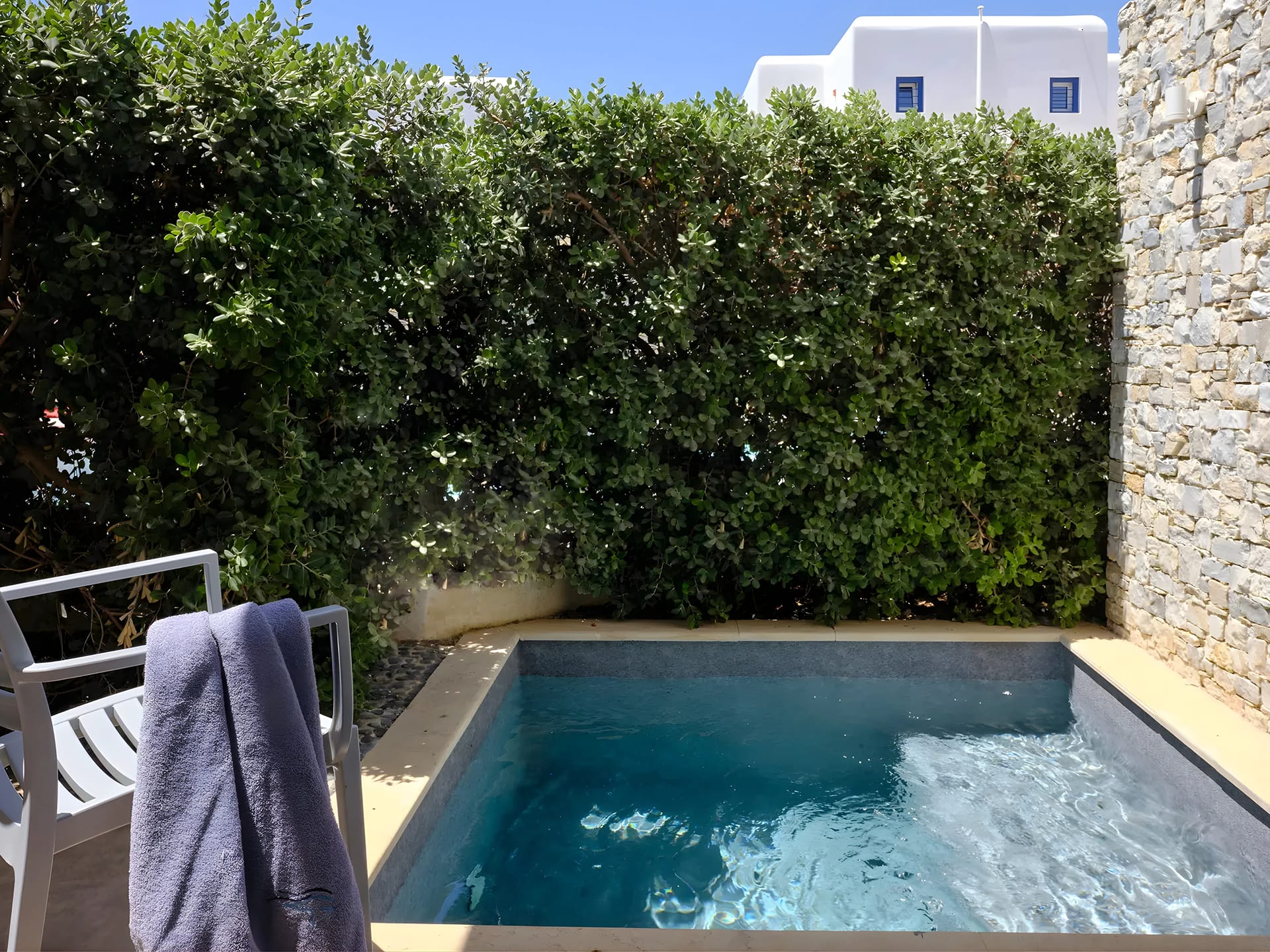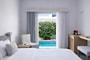 A serene retreat featuring a private sea-view balcony, a refined bathroom, modern furnishings, and a king-size bed. The suite also offers a private plunge pool. Amenities include individually controlled air conditioning, satellite TV, direct-dial telephone, music system, minibar/refrigerator, and hairdryer.